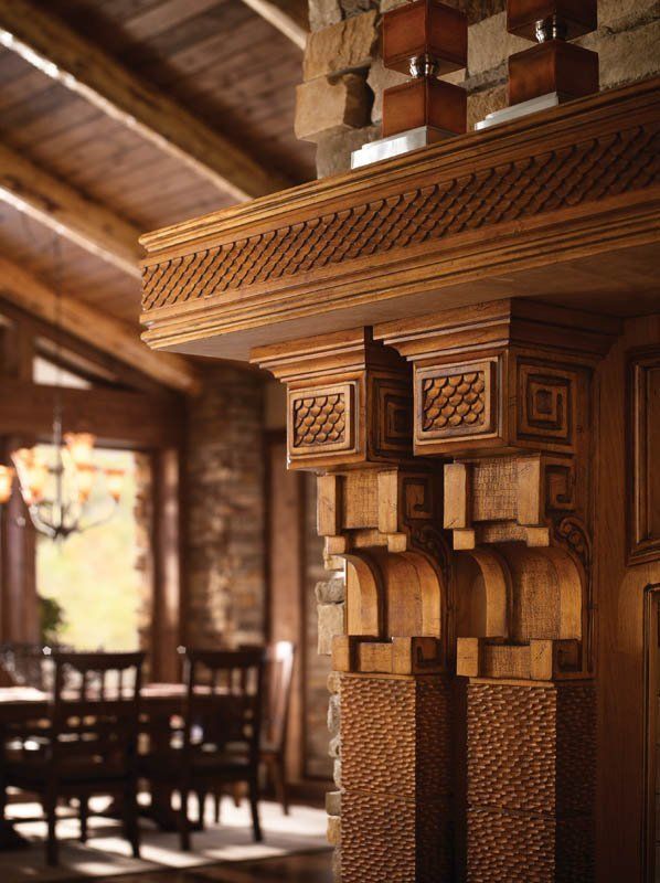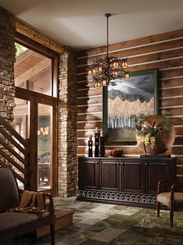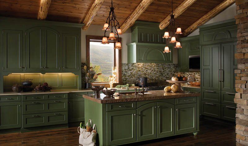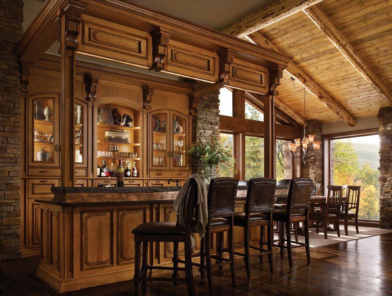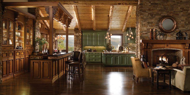 The Mountain Retreat Design Theme is representative of a weekend getaway or second home. The bar, with Esperanto doors in a stain finish contrasts with the Cottage Green finish on the Essex and Kensington kitchen cabinetry. The room’s cozy warmth makes this space ideal for rest and relaxation.