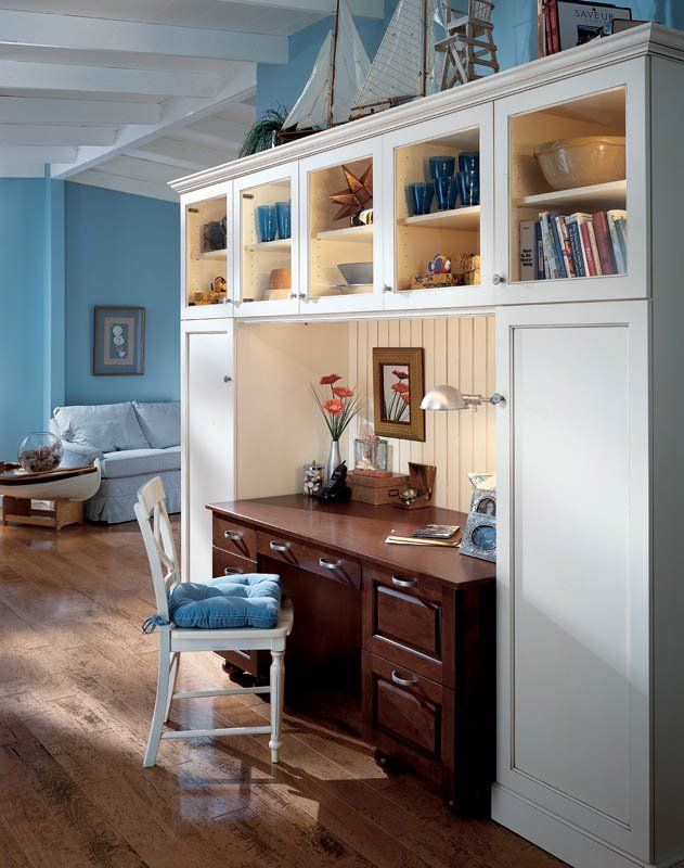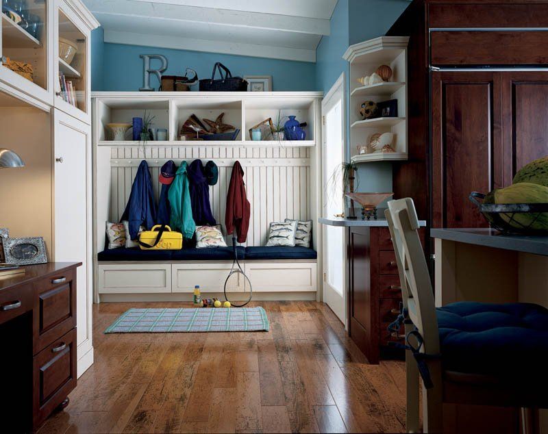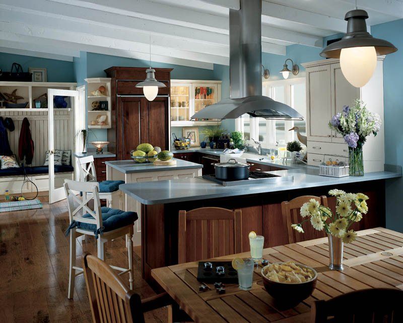The clean lines of Edgemont cabinetry in Maple are perfect for this Seaside Cottage, but they also span traditional, country, and a warmer contemporary styling. The base and tall cabinets are shown here in Edgemont Raised with a stain finish; the wall cabinets and the island, in Edgemont Recessed with an Heirloom finish. Moulding and trim details add a final decorative touch.